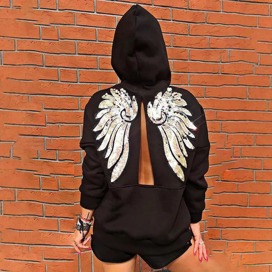 2 Piece Sets Women Sequin Wings Pattern Back Slit Long Sleeve Hooded Sweatshirt & Casual Daily Shorts Suit Outfits 2024 Spring