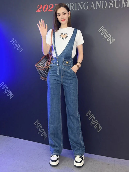 2024 Summer New Suit Women's Fashion Denim Suspender Pants Hollow Love Cotton Short Sleeve T-shirt Unique Two-Piece Set